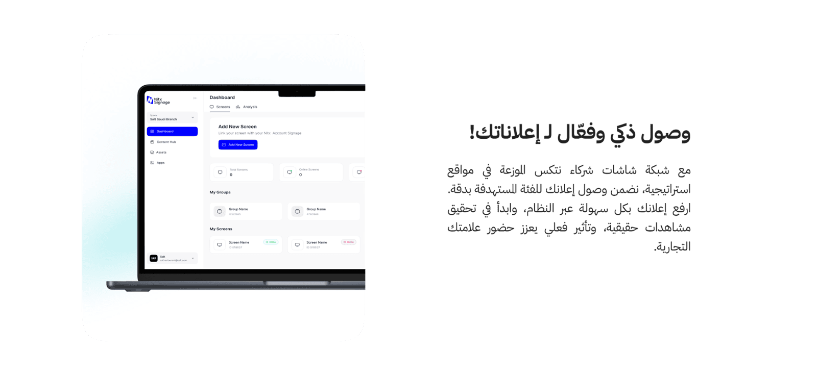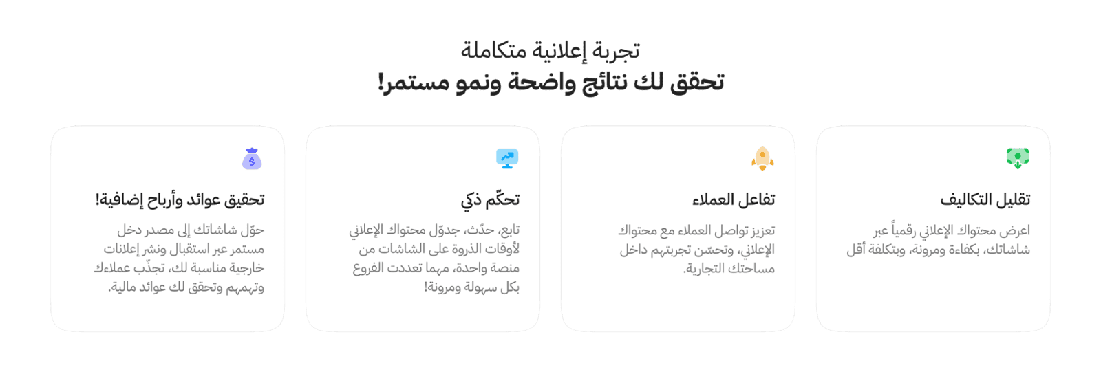من خلال منصة متكاملة وفرنا لك تجربة رقمية متقدمة تمكّنك كمعلن من الوصول إلى جمهورك المستهدف بدقة و ذكاء عبر جميع المنصات و الشاشات الاعلانية و الحصول على تقارير فورية من منصة واحدة